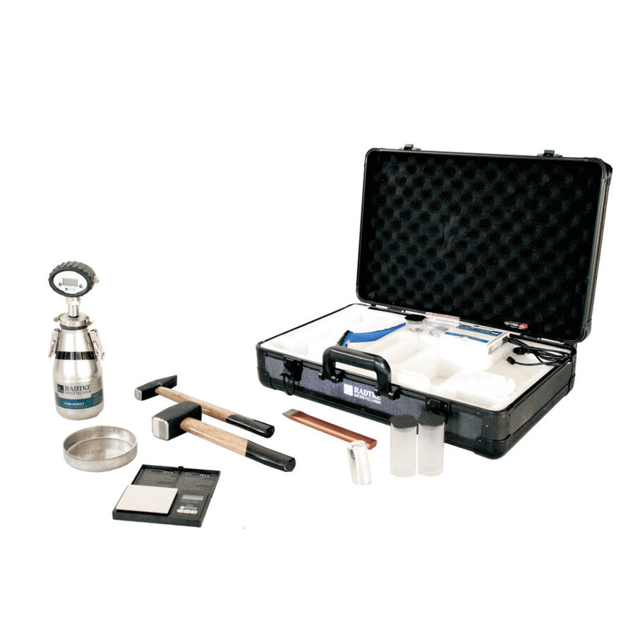 Set dolazi u koferu sa izgledom aluminijumske alatke i sadrži izdržljiv digitalni manometar, digitalnu džepnu vagu sa rezolucijom od 0,05 g, manometar sa poklopcem za prigušenje i direktnim očitavanjem vlage za uzorke mase 10 g, 20 g, 50 g i 100 g, kalibrisanu bocu pod pritiskom sa površinskim termometrom, kao i dodatni merni pribor.