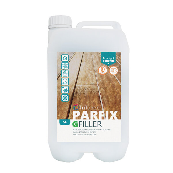 Šifra artikla: PARFIX G FILLERMasa za fugovanje parketa na bazi vode ojačana vlaknima koja smanjuje skupljanje uz blagi miris. Dizajniran je za popunjavanje neravnina i malih fuga širine do 3 mm.